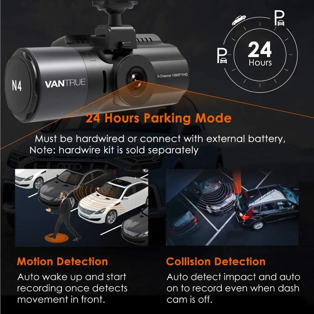 The Vantrue N4 is a 3-channel dash cam that will keep you aware of what is going on around your vehicle no matter where you are. The camera is designed with high-quality night vision that uses an F1.4 aperture and six glass lenses in one camera and an F1.8 aperture with the same amount of lenses in another.