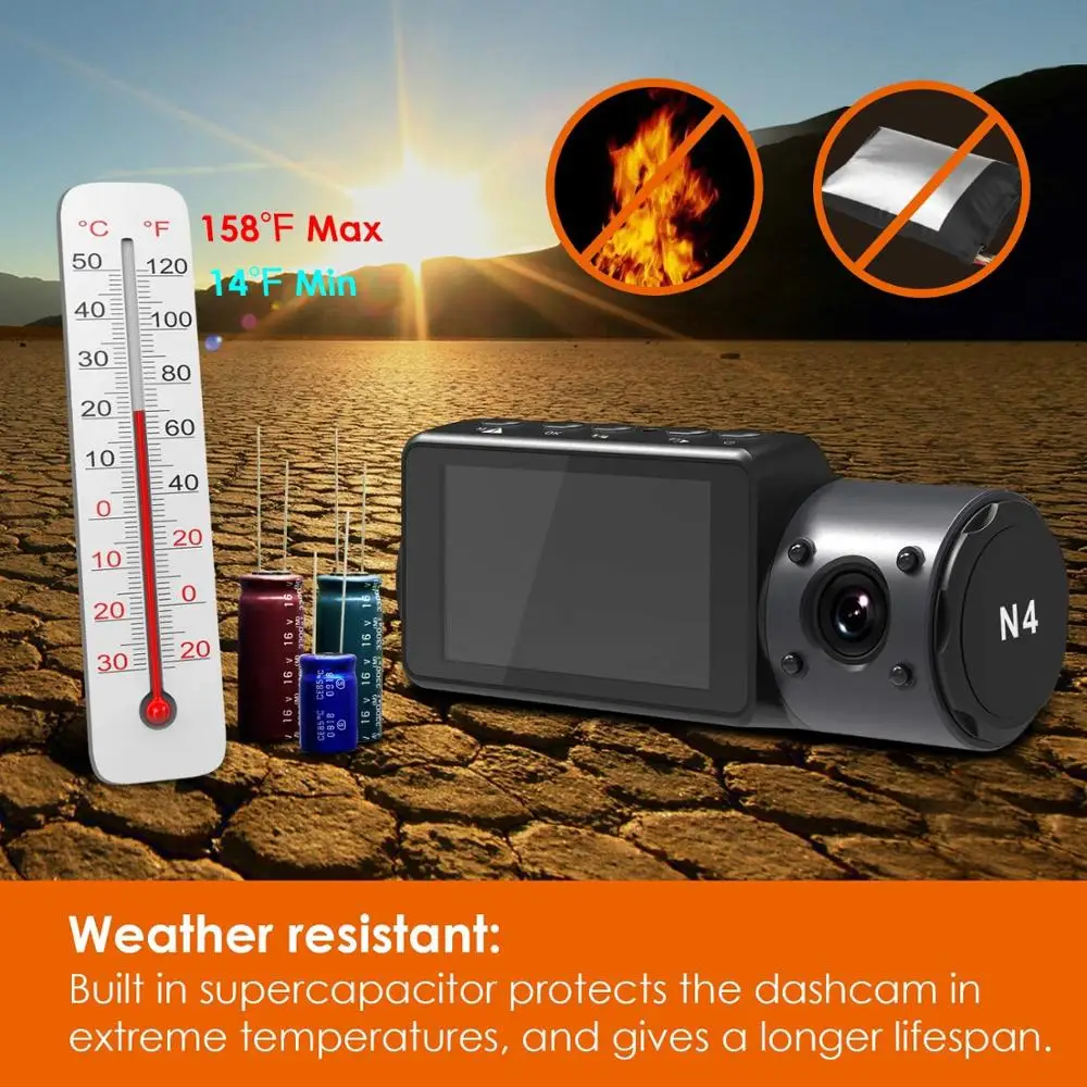 The 4 IR LED lights in the front camera will capture the entire cabin even when it is pitch black outside. Plus, the camera comes with a 24-hour parking mode and weather resistance