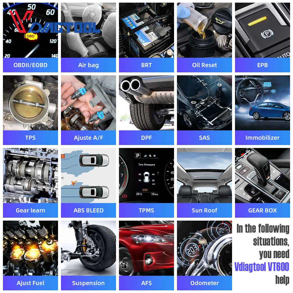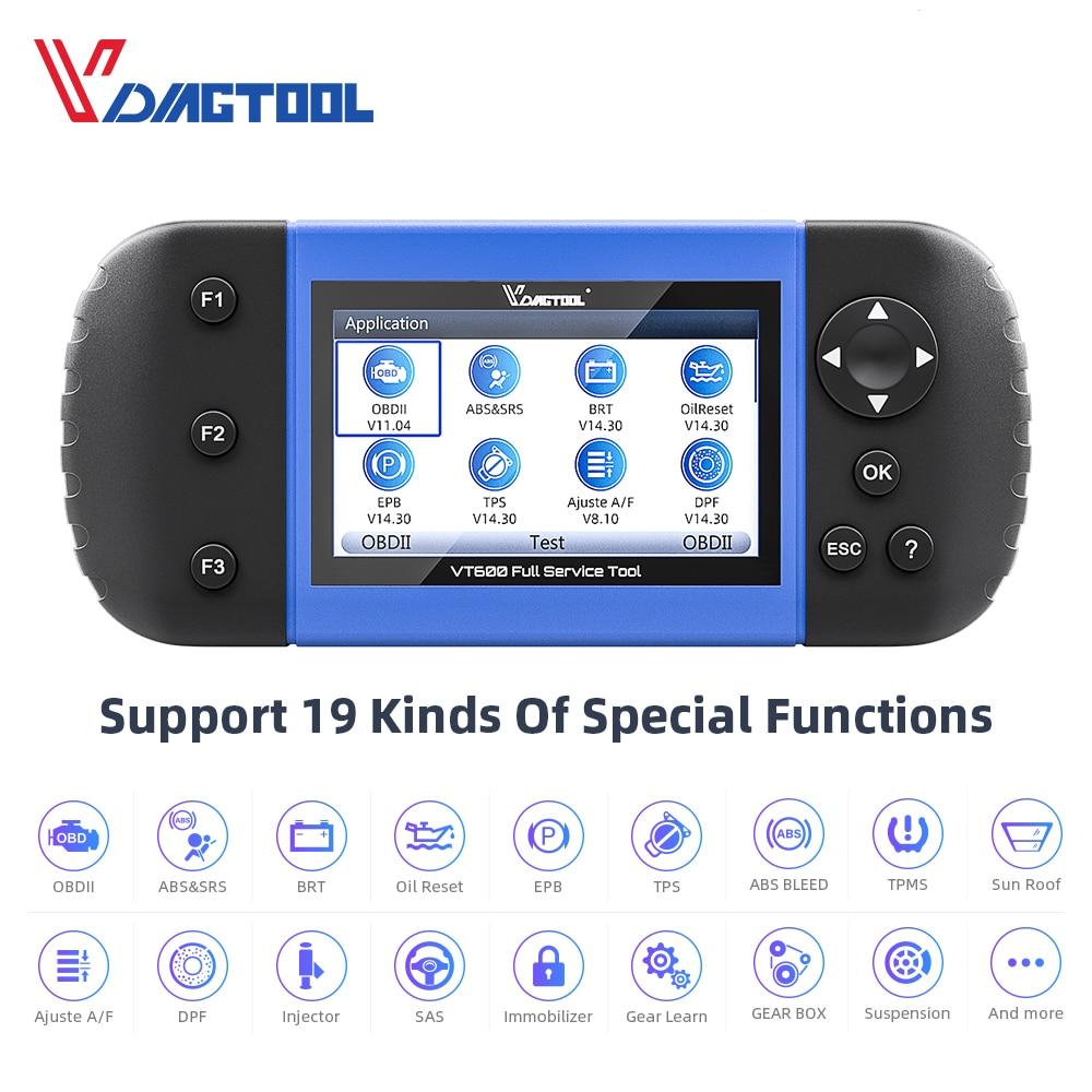 The unit is fitted with multiple analysis functions, including those for the motor, transmission, ABS, airbag, and steering wheel. The VT600 SCANNER can be upgraded online via TF card, and the TF card can upload a record so that you can print out the results of the test using a PC.