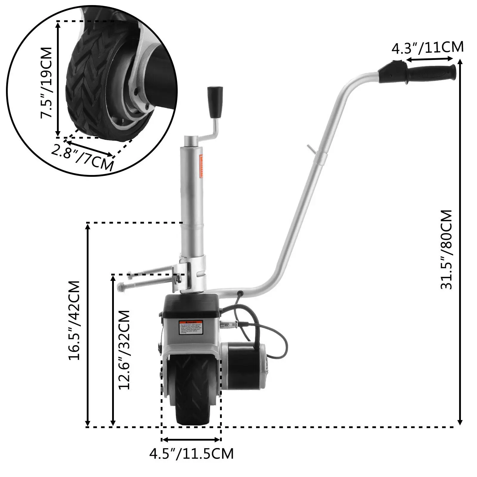 Crafted with a forward and backward option capability, as well as an auto brake, the jockey wheel can help park or tow your trailer behind your vehicle with ease. The unit is designed with an ergonomic control handle, a heavy-duty rubber wheel, an easily adjusted mounting bracket, and a powerful control box and motor.